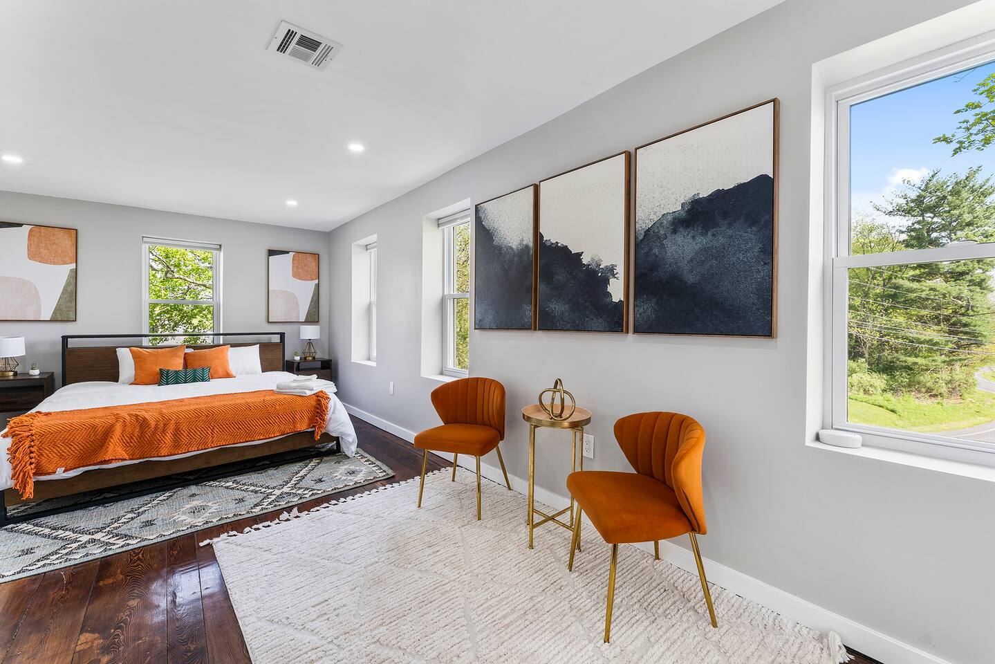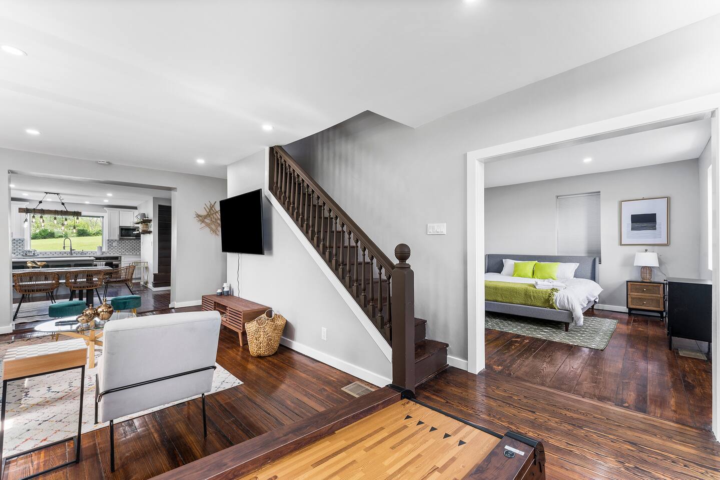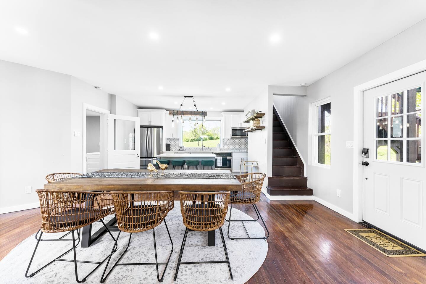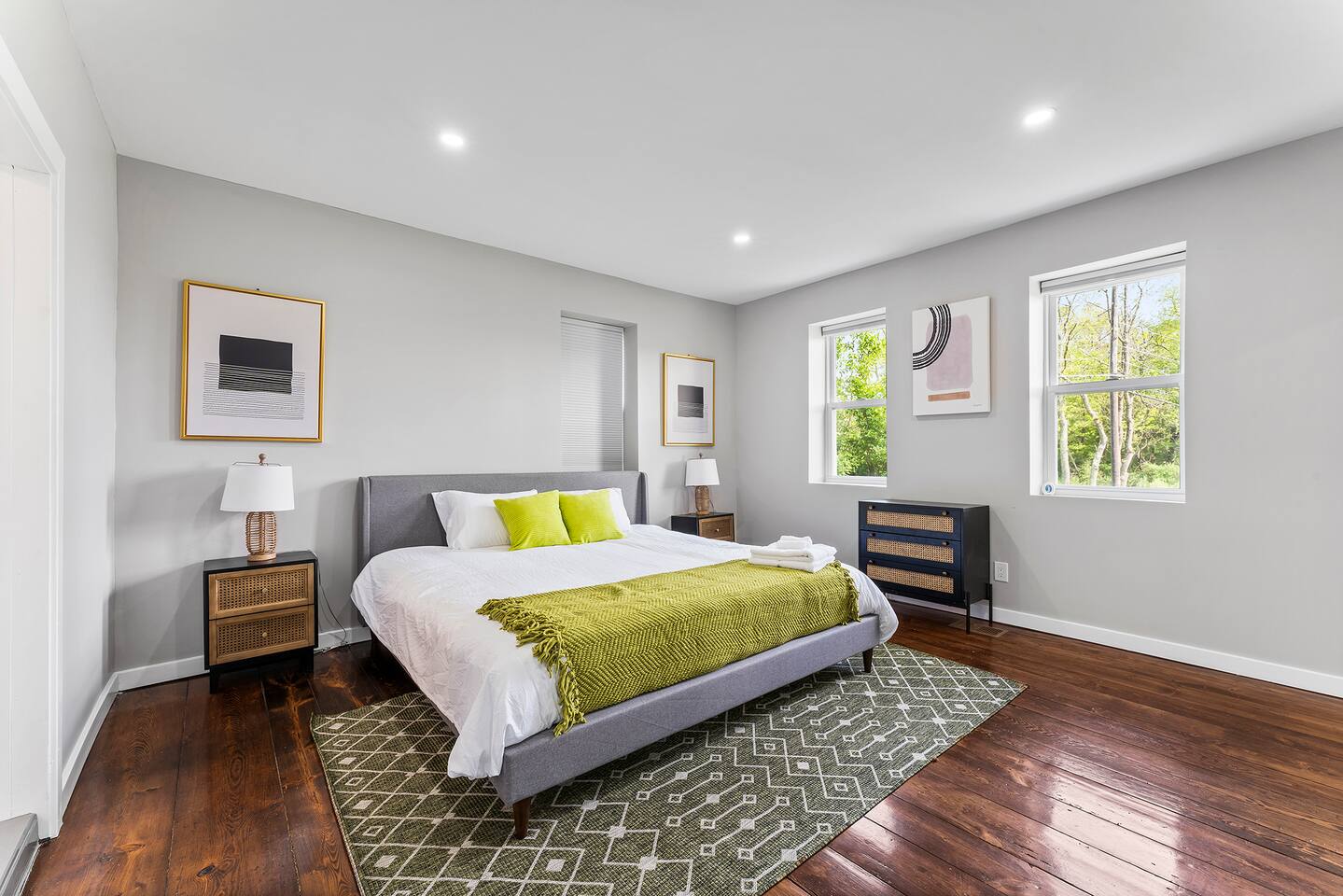 Turn of the century farmhouse with restored hardwood flooring, modern kitchen, and baths. KEY FEATURES: ☀ 5 large bedrooms; 3 double beds, 2 King beds ☀ 3.5 bathrooms ☀ Fully-equipped kitchen with modern appliances ☀ Spacious, modern lounge with fun games ☀ Sunny patio + outdoor lounge spaces ☀ Washer + dryer ☀ Pets allowed. $15/per day, max of 3 pets ☀ 14 mins from all the outdoor resort adventure parks ( e.i. Jim Thorpe River Adventure, Kalahari Resort & Camelback Mountain Adventures) ☆☆ BEDROOMS ☆☆ Our guest house has five bedrooms and can accommodate up to ten guests comfortably. The rooms are spread out throughout the home to make sure everyone has plenty of peace. Three of the bedrooms have luxury double-sized beds, and the two bedrooms have a king-sized bed. The expertly designed bedrooms feature neutral color tones, large windows, vinyl plank flooring, high-end linens, and locally inspired artwork. Each bedroom is designed to reflect the natural beauty right outside, and give guests a comfortable place to unwind after a busy day. Our playful space is perfect for kids or adults and is just steps from the family bathroom. ☆☆ BATHROOMS ☆☆ 3.5 Bathrooms, located on the ground and second floor. Whether you want to soak your muscles after a day of shopping or enjoy a hot steamy shower first thing in the morning, these bathrooms give you the space and modern amenities to make you feel pampered. ☆☆ KITCHEN & LOUNGE ☆☆ The spacious kitchen features bold black tilework, wooden countertops, custom cabinets, and stainless steel appliances. The sleek and stylish kitchen is big enough for multiple guests to move around, and is complete with cooking essentials, including a Keurig, coffee pods, and creamer. The kitchen flows effortlessly into the living room, which is a sun-filled space designed to bring everyone together. Here you’ll find grand, lofty ceilings, and plenty of comfy seating on a massive sectional couch. Host a movie night on the 60-inch smart TV, or break out the board games for more family fun. The walls of windows offer stunning nature views, and the nature-inspired decor ties it all together. If it’s important to you to get quality time together while on vacation, you’ll appreciate the formal dining area. Serve a family-style meal here and share your adventures! Downstairs, the ground floor has been transformed into a family-friendly recreation center, complete with board games, and comfortable lounge furniture. ☆☆ OUTSIDE SPACE ☆☆ Our guest house offers multiple ways to enjoy the outdoors. Our backyard is dotted with trees and is perfect for running and playing.