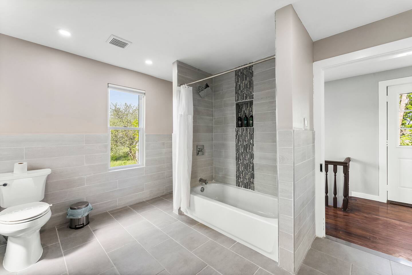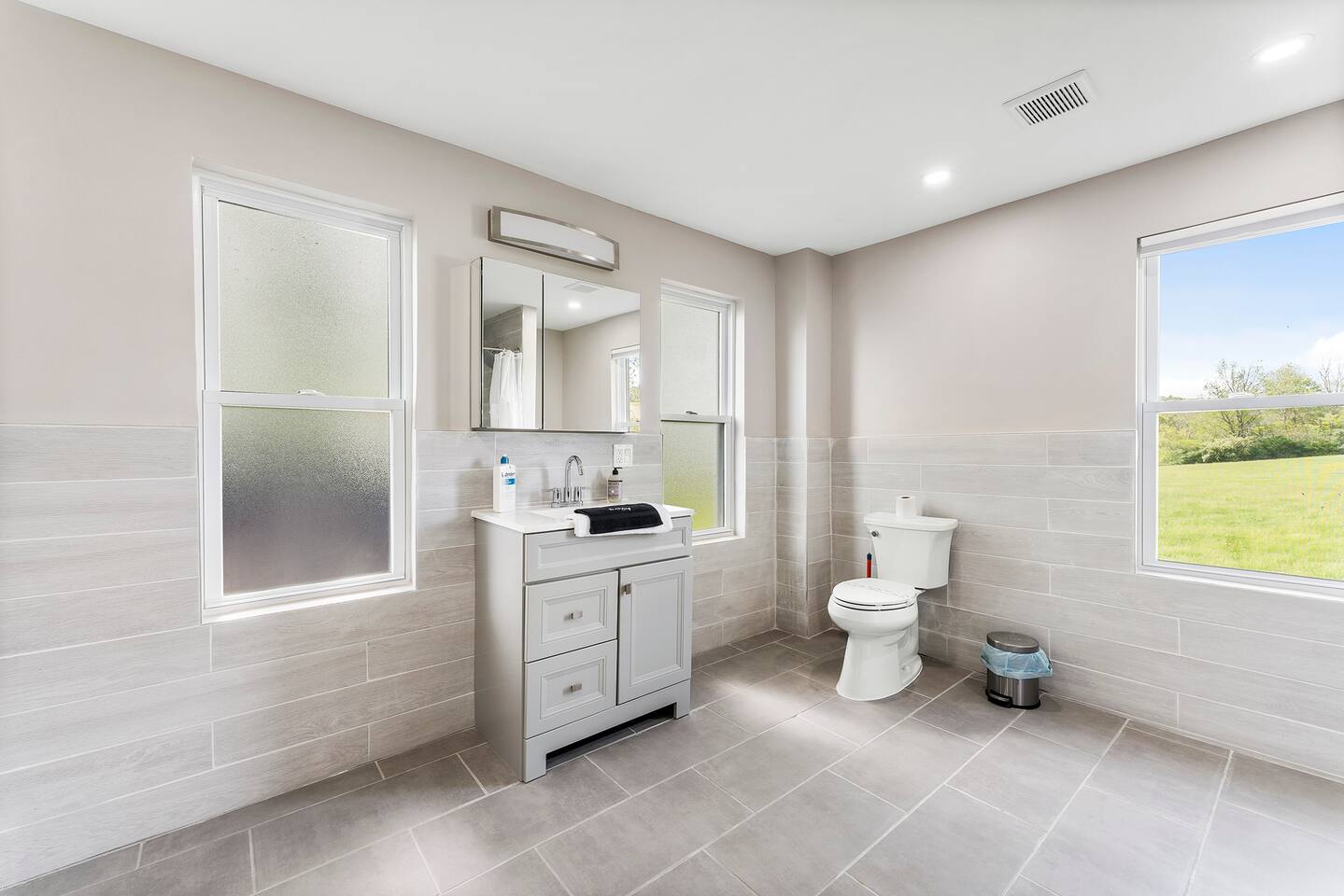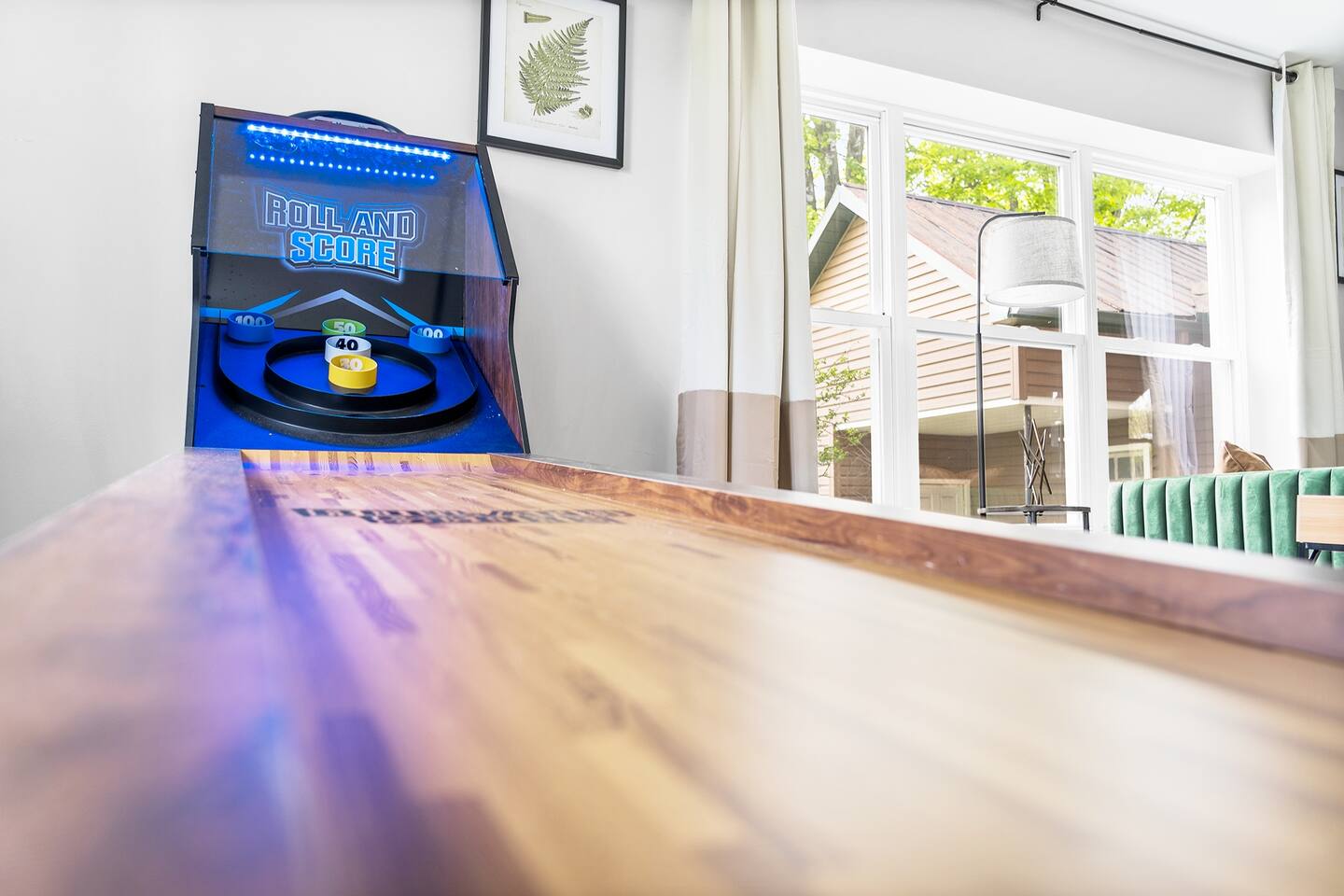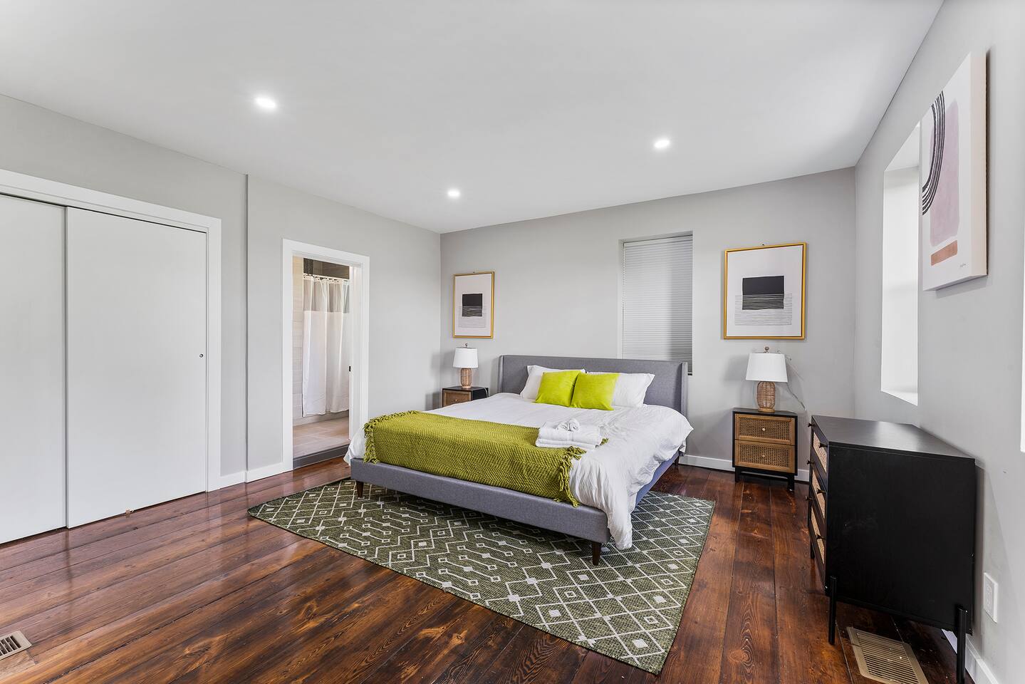 Turn of the century farmhouse with restored hardwood flooring, modern kitchen, and baths. KEY FEATURES: ☀ 5 large bedrooms; 3 double beds, 2 King beds ☀ 3.5 bathrooms ☀ Fully-equipped kitchen with modern appliances ☀ Spacious, modern lounge with fun games ☀ Sunny patio + outdoor lounge spaces ☀ Washer + dryer ☀ Pets allowed. $15/per day, max of 3 pets ☀ 14 mins from all the outdoor resort adventure parks ( e.i. Jim Thorpe River Adventure, Kalahari Resort & Camelback Mountain Adventures) ☆☆ BEDROOMS ☆☆ Our guest house has five bedrooms and can accommodate up to ten guests comfortably. The rooms are spread out throughout the home to make sure everyone has plenty of peace. Three of the bedrooms have luxury double-sized beds, and the two bedrooms have a king-sized bed. The expertly designed bedrooms feature neutral color tones, large windows, vinyl plank flooring, high-end linens, and locally inspired artwork. Each bedroom is designed to reflect the natural beauty right outside, and give guests a comfortable place to unwind after a busy day. Our playful space is perfect for kids or adults and is just steps from the family bathroom. ☆☆ BATHROOMS ☆☆ 3.5 Bathrooms, located on the ground and second floor. Whether you want to soak your muscles after a day of shopping or enjoy a hot steamy shower first thing in the morning, these bathrooms give you the space and modern amenities to make you feel pampered. ☆☆ KITCHEN & LOUNGE ☆☆ The spacious kitchen features bold black tilework, wooden countertops, custom cabinets, and stainless steel appliances. The sleek and stylish kitchen is big enough for multiple guests to move around, and is complete with cooking essentials, including a Keurig, coffee pods, and creamer. The kitchen flows effortlessly into the living room, which is a sun-filled space designed to bring everyone together. Here you’ll find grand, lofty ceilings, and plenty of comfy seating on a massive sectional couch. Host a movie night on the 60-inch smart TV, or break out the board games for more family fun. The walls of windows offer stunning nature views, and the nature-inspired decor ties it all together. If it’s important to you to get quality time together while on vacation, you’ll appreciate the formal dining area. Serve a family-style meal here and share your adventures! Downstairs, the ground floor has been transformed into a family-friendly recreation center, complete with board games, and comfortable lounge furniture. ☆☆ OUTSIDE SPACE ☆☆ Our guest house offers multiple ways to enjoy the outdoors. Our backyard is dotted with trees and is perfect for running and playing.