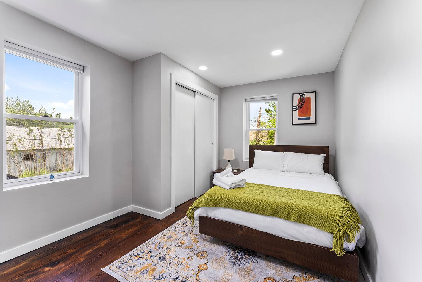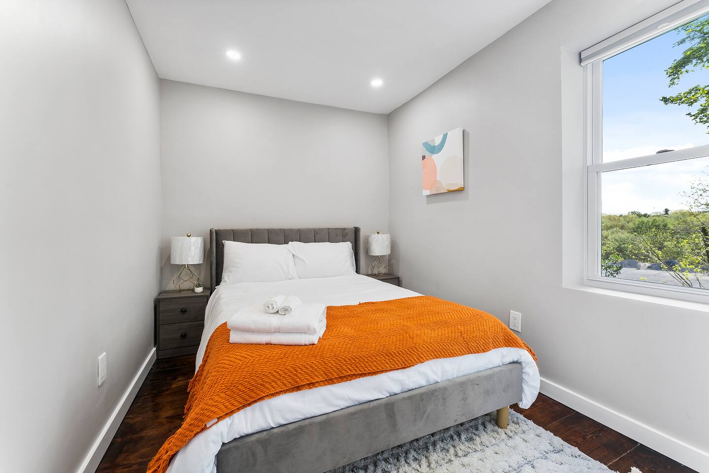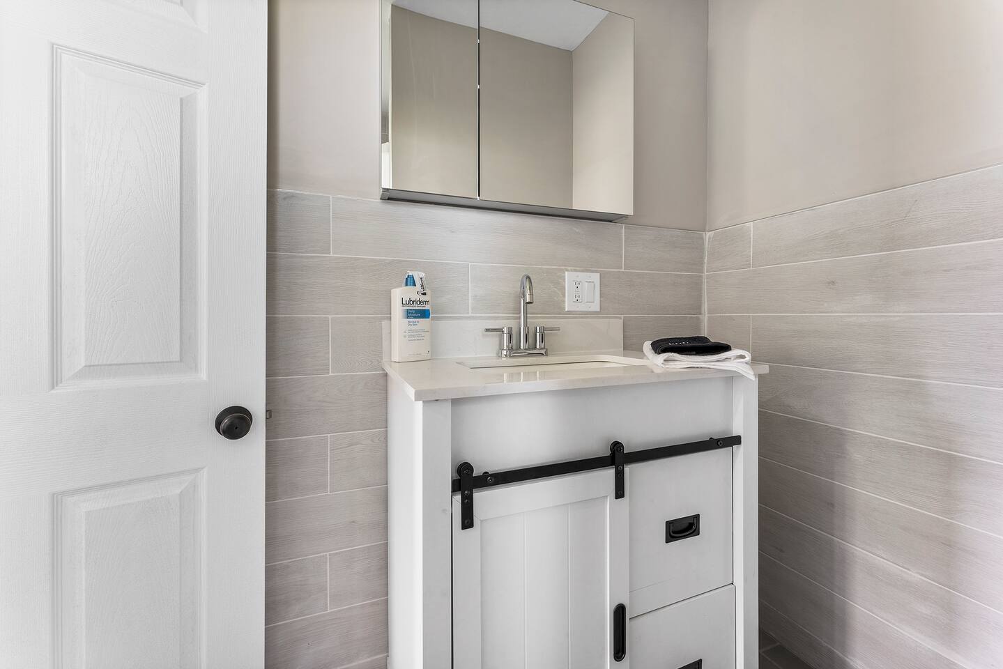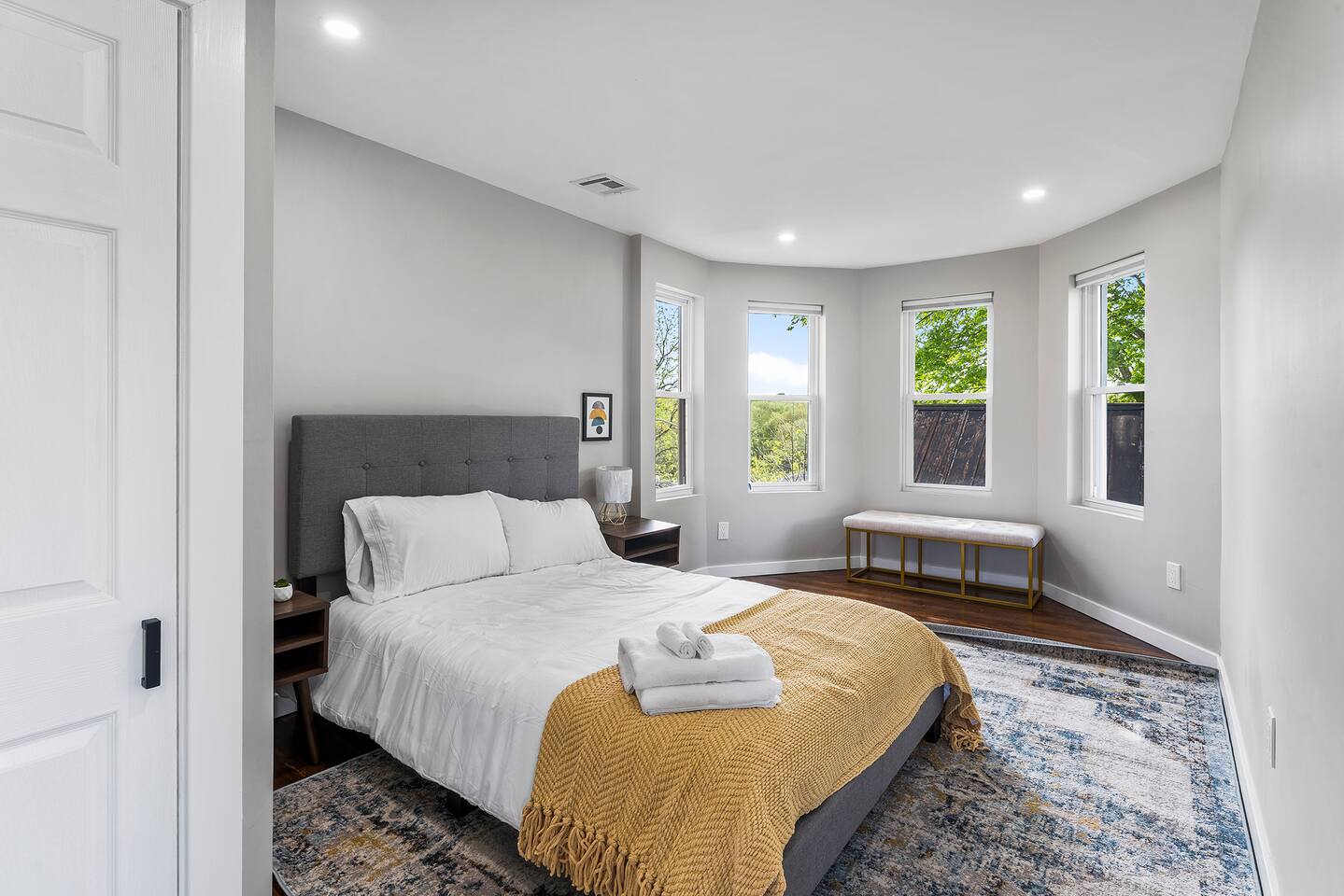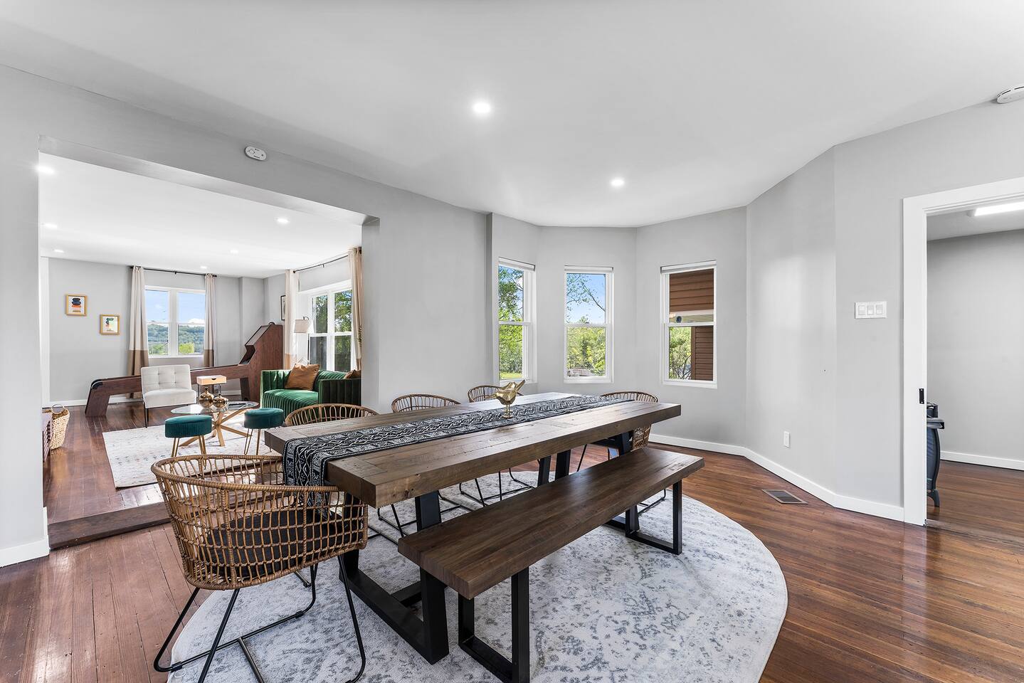 Turn of the century farmhouse with restored hardwood flooring, modern kitchen, and baths. KEY FEATURES: ☀ 5 large bedrooms; 3 double beds, 2 King beds ☀ 3.5 bathrooms ☀ Fully-equipped kitchen with modern appliances ☀ Spacious, modern lounge with fun games ☀ Sunny patio + outdoor lounge spaces ☀ Washer + dryer ☀ Pets allowed. $15/per day, max of 3 pets ☀ 14 mins from all the outdoor resort adventure parks ( e.i. Jim Thorpe River Adventure, Kalahari Resort & Camelback Mountain Adventures) ☆☆ BEDROOMS ☆☆ Our guest house has five bedrooms and can accommodate up to ten guests comfortably. The rooms are spread out throughout the home to make sure everyone has plenty of peace. Three of the bedrooms have luxury double-sized beds, and the two bedrooms have a king-sized bed. The expertly designed bedrooms feature neutral color tones, large windows, vinyl plank flooring, high-end linens, and locally inspired artwork. Each bedroom is designed to reflect the natural beauty right outside, and give guests a comfortable place to unwind after a busy day. Our playful space is perfect for kids or adults and is just steps from the family bathroom. ☆☆ BATHROOMS ☆☆ 3.5 Bathrooms, located on the ground and second floor. Whether you want to soak your muscles after a day of shopping or enjoy a hot steamy shower first thing in the morning, these bathrooms give you the space and modern amenities to make you feel pampered. ☆☆ KITCHEN & LOUNGE ☆☆ The spacious kitchen features bold black tilework, wooden countertops, custom cabinets, and stainless steel appliances. The sleek and stylish kitchen is big enough for multiple guests to move around, and is complete with cooking essentials, including a Keurig, coffee pods, and creamer. The kitchen flows effortlessly into the living room, which is a sun-filled space designed to bring everyone together. Here you’ll find grand, lofty ceilings, and plenty of comfy seating on a massive sectional couch. Host a movie night on the 60-inch smart TV, or break out the board games for more family fun. The walls of windows offer stunning nature views, and the nature-inspired decor ties it all together. If it’s important to you to get quality time together while on vacation, you’ll appreciate the formal dining area. Serve a family-style meal here and share your adventures! Downstairs, the ground floor has been transformed into a family-friendly recreation center, complete with board games, and comfortable lounge furniture. ☆☆ OUTSIDE SPACE ☆☆ Our guest house offers multiple ways to enjoy the outdoors. Our backyard is dotted with trees and is perfect for running and playing.